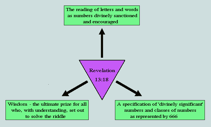 6. The significance of Revelation 13:18 - As investigations in this field have proceeded over the past 20 or so years, it has become increasingly obvious that Revelation 13:18 is a pivotal verse. Here is the statement as we find it expressed in the Authorised Version of the Bible: "Here is wisdom. Let him that hath understanding count the number of the beast: for it is the number of a man; and his number is Six hundred threescore and six." These much-neglected words (from the mouth of the Lord) are highly informative - and this quite independently of what appears at first glance to be their prime purpose, viz the identification of a particular individual - for consider: